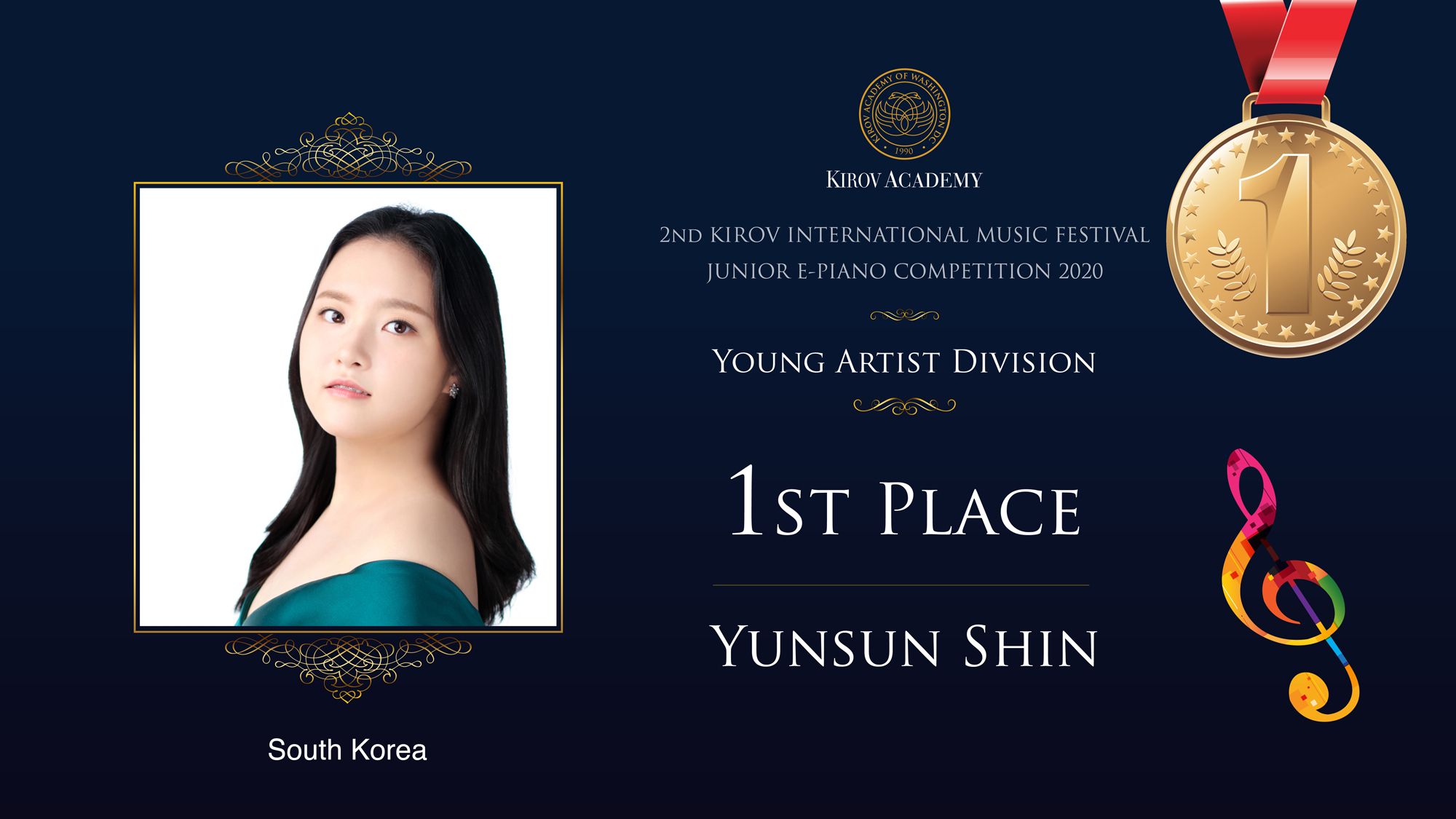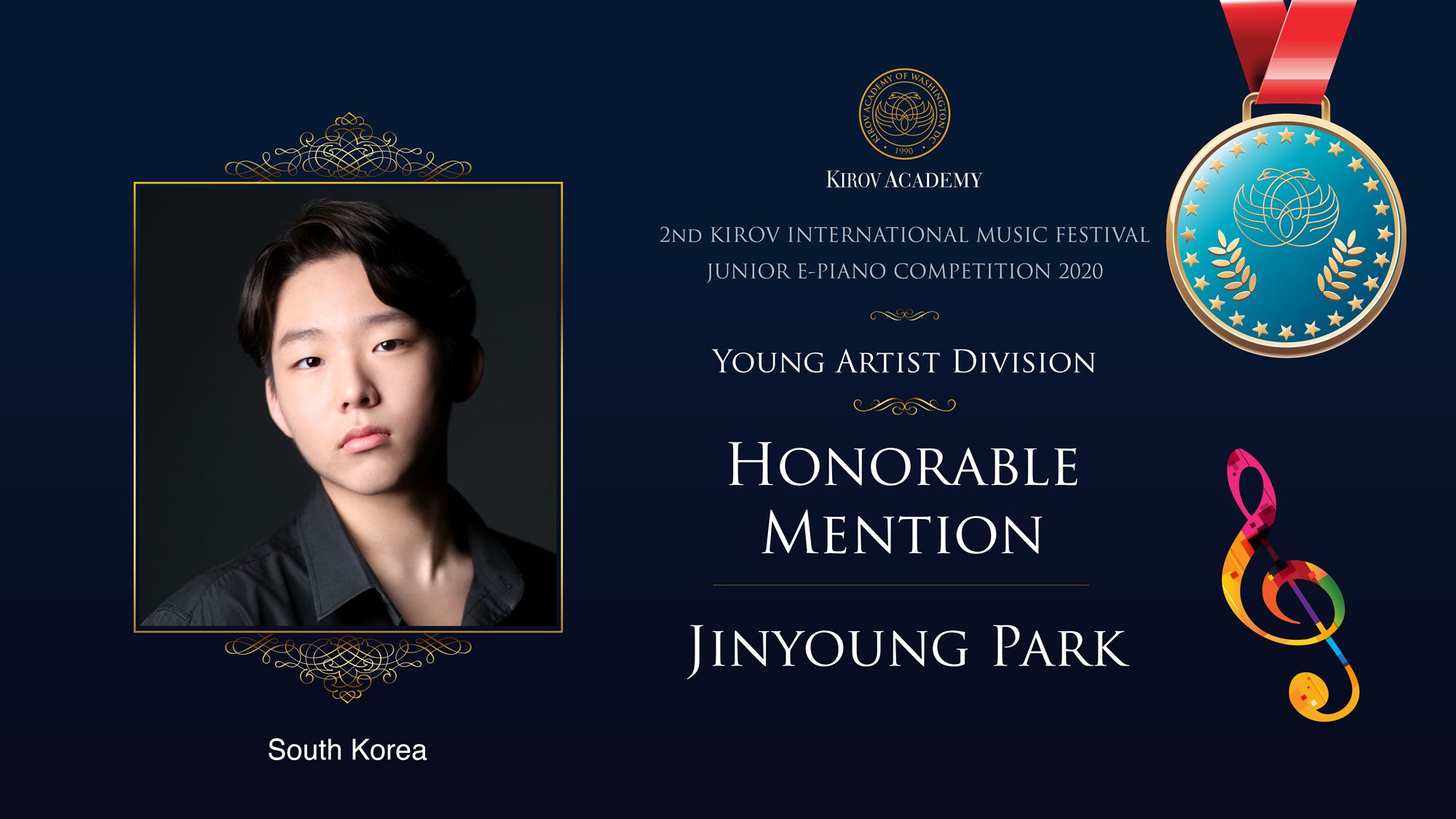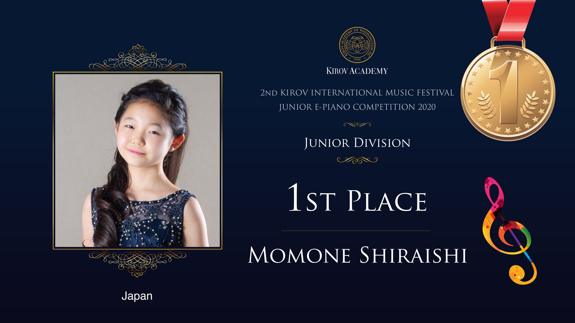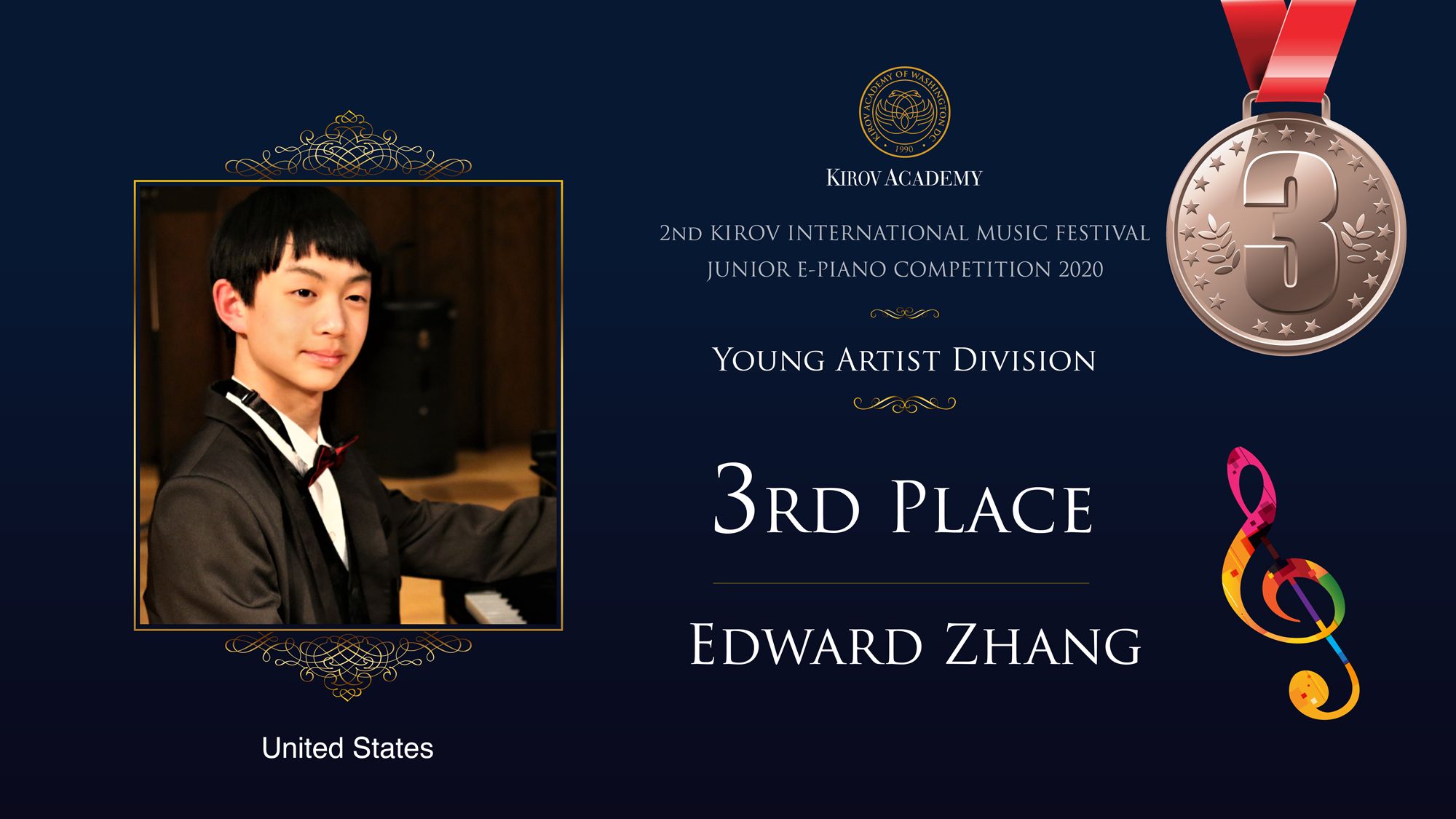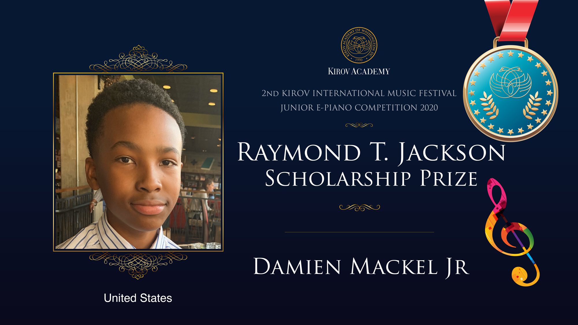 First, Second, and Third Prize winners will perform at the Kennedy Center in Washington D.C. in 2021 and are invited as scholarship participants to the 2021 Kirov International Music Festival. Laureates will also participate in masterclasses with internationally renowned artists.