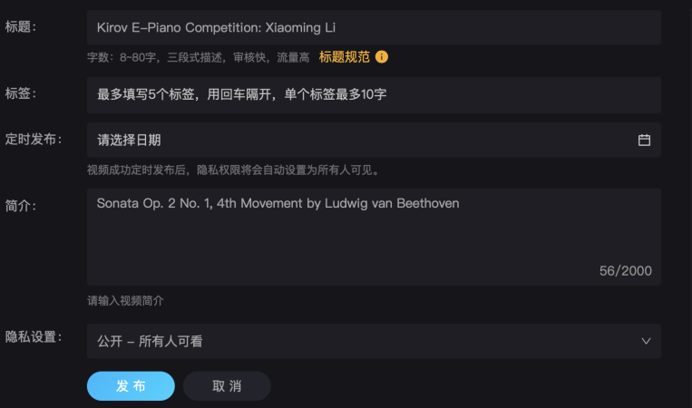 b. 简介:作品名称 例如:Sonata Op. 2 No. 1, 4th Movement by Ludwig van Beethoven *参赛者请将作品名称在视频发布之后,再于评论区输入,如名称过长请分开发布在评论区。 | |